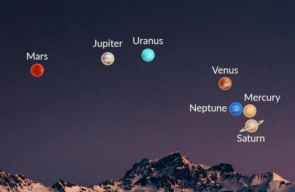 ಈ ಪ್ರಪಂಚ, ಆಕಾಶ, ಭೂಮಿ , ಸಮುದ್ರ ಎಲ್ಲವೂ ಒಂದು ಅಚ್ಚರಿ ಅಂದರೆ ತಪ್ಪಾಗಲಾರದು. ಇವತ್ತು ಅಂತಹದ್ದೆ ಒಂದು ದೃಶ್ಯವನ್ನ ನೀವು ನೋಡಬಹುದು. ಇಂದು ಗ್ರಹಗಳ ಮೆರವಣಿಗೆ ನಡೆಯುತ್ತದೆ ಅಂದರೆ ತಪ್ಪಾಗಲಾರದು. ಶನಿ, ಬುಧ, ನೆಪ್ಚೂನ್, ಶುಕ್ರ, ಯುರೇನಸ್, ಗುರು ಮತ್ತು ಮಂಗಳ ಎಲ್ಲಾ ಗ್ರಹಗಳು ಸಂಜೆ ಆಕಾಶದಲ್ಲಿ ಸಾಲುಗಟ್ಟಿ ನಿಲ್ಲುತ್ತವೆ. ಈ ಸಂಯೋಜನೆಯು ಈ ದಶಕದಲ್ಲಿ ಮತ್ತೆ ಸಂಭವಿಸುವುದಿಲ್ಲ ಎಂದೇ ಹೇಳಲಾಗುತ್ತಿದೆ.