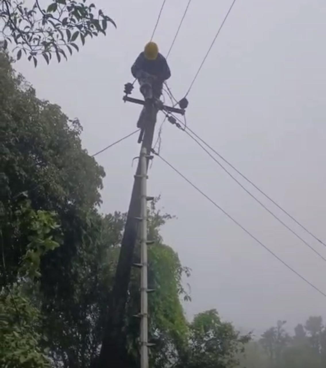 ಕಳಸ ಪಟ್ಟಣ ಸೇರಿದಂತೆ ಸುತ್ತಮುತ್ತಲ ಗ್ರಾಮಗಳಲ್ಲಿ ವಿದ್ಯುತ್ ಕೈ ಕೊಟ್ಟಿತ್ತು. ಬಿಟ್ಟುಬಿಡದೆ ಸುರಿಯುತ್ತಿರುವ ಮಳೆಯಿಂದಾಗಿ ವಿದ್ಯುತ್ ಕಂಬಗಳಲ್ಲಿ ಸಮಸ್ಯೆ ಪದೇ ಪದೇ ತಲೆದೋರುವುದು ಸಾಮಾನ್ಯವಾಗಿದೆ. ವಿದ್ಯುತ್ ಇಲ್ಲದ ವಿಷಯ ಕರೆ ಮಾಡಿ ಮೆಸ್ಕಾಂ ಕಚೇರಿಗೆ ತಿಳಿಸಿದ ಕೆಲವೇ ಸಮಯದಲ್ಲಿ ಸ್ಥಳಕ್ಕೆ ಆಗಮಿಸಿದ ಮೆಸ್ಕಾಂ ನೌಕರರೊಬ್ಬರು ಜೋರಾಗಿ ಸುರಿಯುವ ಮಳೆಯ ನಡುವೆಯೇ ವಿದ್ಯುತ್ ಕಂಬ ಏರಿ ದುರಸ್ತಿ ಕಾರ್ಯ ಮಾಡಿದ್ದಾರೆ. ಅಲ್ಯೂಮಿನಿಯಂ ಏಣಿ ಏರಿ ವಿದ್ಯುತ್ ದುರಸ್ತಿ ನಡೆಸಿದ್ದಾರೆ. ನೌಕರನ ಶಿಸ್ತಿನ ಕಾರ್ಯಕ್ಕೆ ಕಳಸ ಪಟ್ಟಣದ ನಿವಾಸಿಗಳು ಮೆಚ್ಚುಗೆ ವ್ಯಕ್ತಪಡಿಸಿದ್ದಾರೆ.
