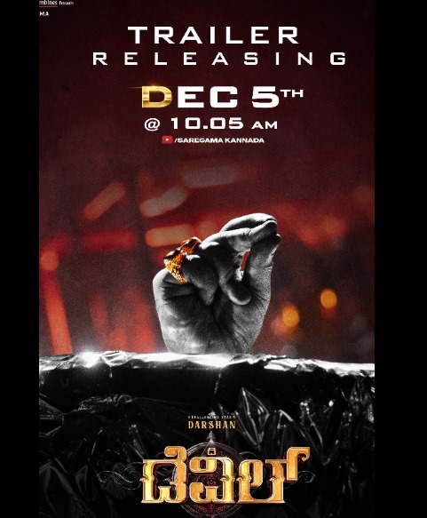 ಚಾಲೆಂಜಿಂಗ್ ಸ್ಟಾರ್ ದರ್ಶನ್ ಅಭಿನಯದ ಹೊಸ ಚಿತ್ರ ‘ಡೆವಿಲ್’ ಸಿನಿಮಾ ಡಿಸೆಂಬರ್ 11 ರಂದು ರಾಜ್ಯಾದ್ಯಂತ ತೆರೆಗೆ ಬರಲಿದೆ. ಈ ಚಿತ್ರದ ಟ್ರೈಲರ್ ಡಿಸೆಂಬರ್ 5 ರಂದು ಬೆಳಗ್ಗೆ 10:05ಕ್ಕೆ ಬಿಡುಗಡೆ ಮಾಡಲು ದಿನಾಂಕ ನಿಗದಿಯಾಗಿದೆ.