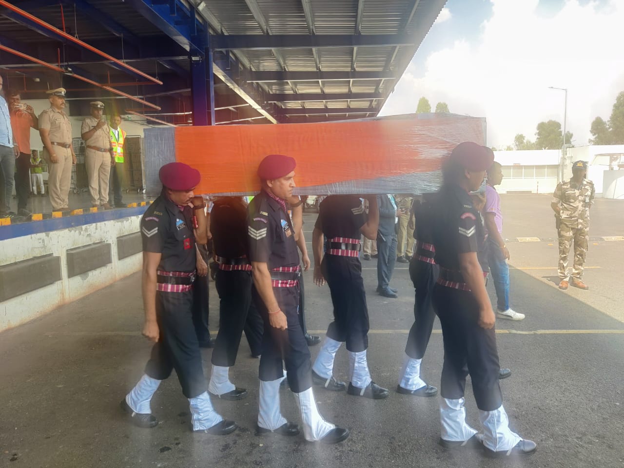 ಪಾಕ್ ದಾಳಿಯಲ್ಲಿ ಆಂಧ್ರಪ್ರದೇಶ ಮೂಲದ ಯೋದ ಹುತಾತ್ಮನ ಮೃತ ಶರೀರವನ್ನು ಮೊದಲು ಜಮ್ಮು ಮೂಲಕ ದೆಹಲಿಯ ಅಂತಾರಾಷ್ಟ್ರೀಯ ವಿಮಾನ ನಿಲ್ದಾಣಕ್ಕೆ ತರಲಾಗಿತ್ತು. ಅಲ್ಲಿಂದ ಬೆಂಗಳೂರಿನ ಕೆಂಪೇಗೌಡ ಅಂತಾರಾಷ್ಟ್ರೀಯ ವಿಮಾನ ನಿಲ್ದಾಣಕ್ಕೆ ರವಾನಿಸಲಾಗಿದೆ. ದೆಹಲಿಯಿಂದ ಇಂಡಿಗೋ ವಿಮಾನದ ಮೂಲಕ ಬೆಂಗಳೂರಿನ ಏರ್ಪೋರ್ಟ್ಗೆ ಬಂದ ಯೋಧನ ಶರೀರವನ್ನು ಕಾರ್ಗೋ ಟರ್ಮಿನಲ್ನಲ್ಲಿ ಇರಿಸಿ ಭಾರತೀಯ ಯೋಧರಿಂದ ಅಂತಿಮ ನಮನ ಸಲ್ಲಿಕೆ ಮಾಡಲಾಗಿದೆ.