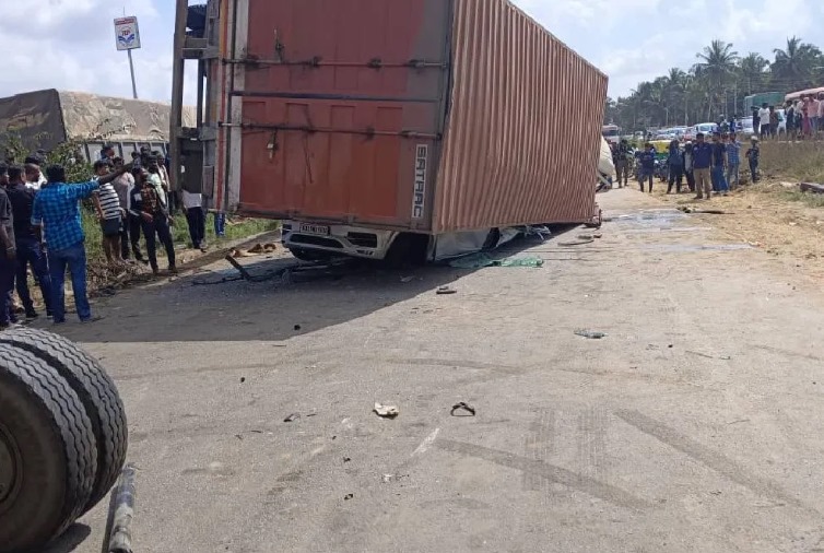 ನೆಲಮಂಗಲ: ಡಿವೈಡರ್ ಮೇಲೆ ಹತ್ತಿದ ಕಂಟೈನರ್ ಲಾರಿ, ಕಾರಿನ ಮೇಲೆ ಉರುಳಿ ಬಿದ್ದು 6 ಜನ ಸ್ಥಳದಲ್ಲೆ ಸಾವನ್ನಪ್ಪಿರುವ ಘಟನೆ ಬೆಂಗಳೂರು ಗ್ರಾಮಾಂತರ ಜಿಲ್ಲೆ ನೆಲಮಂಗಲದ ತಾಳೇಕೆರೆ ಗ್ರಾಮದ ರಾಷ್ಟ್ರೀಯ ಹೆದ್ದಾರಿ 4ರಲ್ಲಿ ನಡೆದಿದೆ. ಚಾಲಕನ ನಿಯಂತ್ರಣ ತಪ್ಪಿ ಲಾರಿ ಕಾರಿನ ಮೇಲೆ ಪಲ್ಟಿಯಾಗಿದೆ. ಪರಿಣಾಮ ಕಾರಿನಲ್ಲಿದ್ದ ಇಬ್ಬರು ಮಕ್ಕಳು ಸೇರಿದಂತೆ ಒಟ್ಟು 6 ಮಂದಿ ಮೃತಪಟ್ಟಿದ್ದಾರೆ.